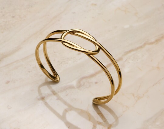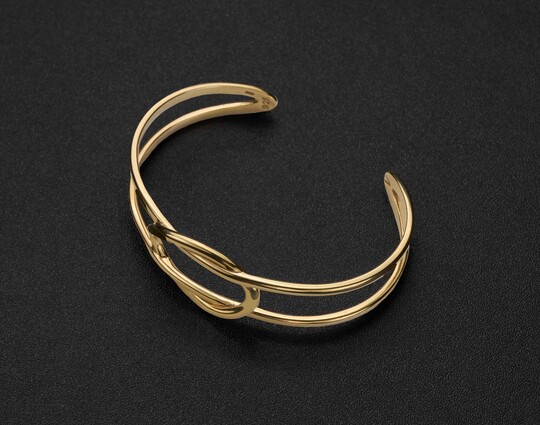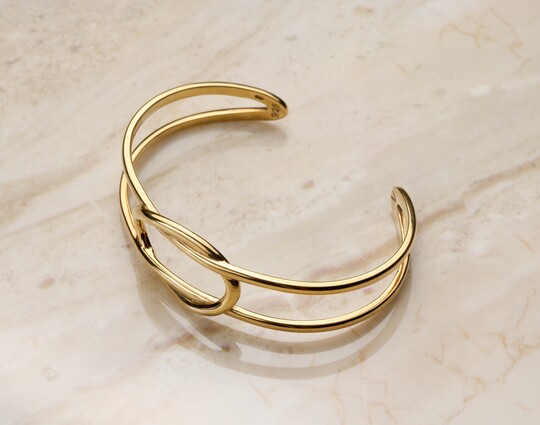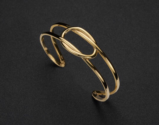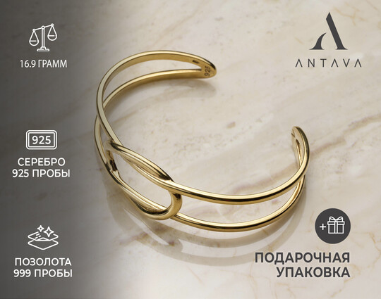 Объемный браслет  -  элегантное украшение, выполненное из серебра 925 пробы с позолотой. Визуально он широкий, но тонкий, удобен в носке и не создает дискомфорта. Браслет без застёжки, что делает его надёжным и легким в использовании.