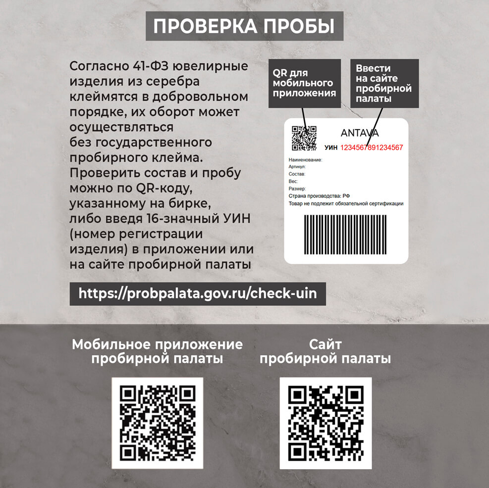 На бирке каждого изделия есть УИН, который можно проверить на сайте Пробирной палаты.